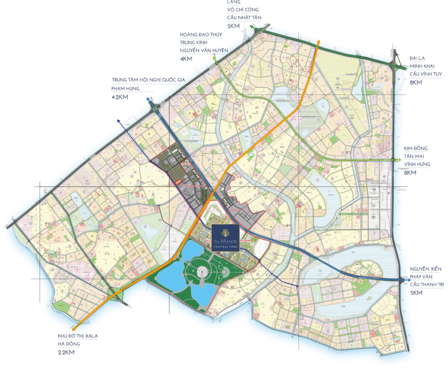 Tọa lạc đắc địa tại cửa ngõ phía Tây Nam thủ đô, The Manor Central Park sở hữu liên kết vùng linh hoạt khi tiếp giáp với các đại lộ lớn (đường vành đai 3, Nguyễn Xiển, Xa La) và được đồng bộ về cơ sở hạ tầng theo quy hoạch đến năm 2030, tầm nhìn 2050 được UBND Hà Nội phê duyệt.
